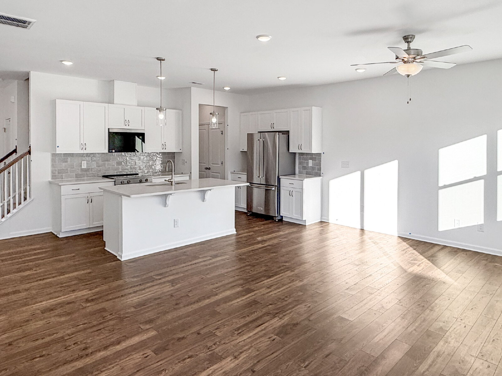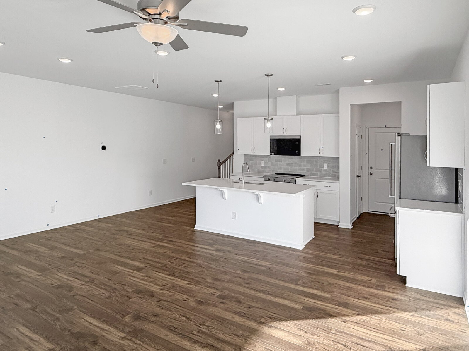 The main level features a bright open-concept living and dining area with high ceilings and luxury vinyl flooring, creating an inviting space for relaxing or entertaining. The modern kitchen is equipped with granite and quartz countertops, electric range, microwave, dishwasher, and ample cabinetry, combining style and functionality. Smart home features, including a smart thermostat and high-speed internet availability, enhance everyday comfort and efficiency.